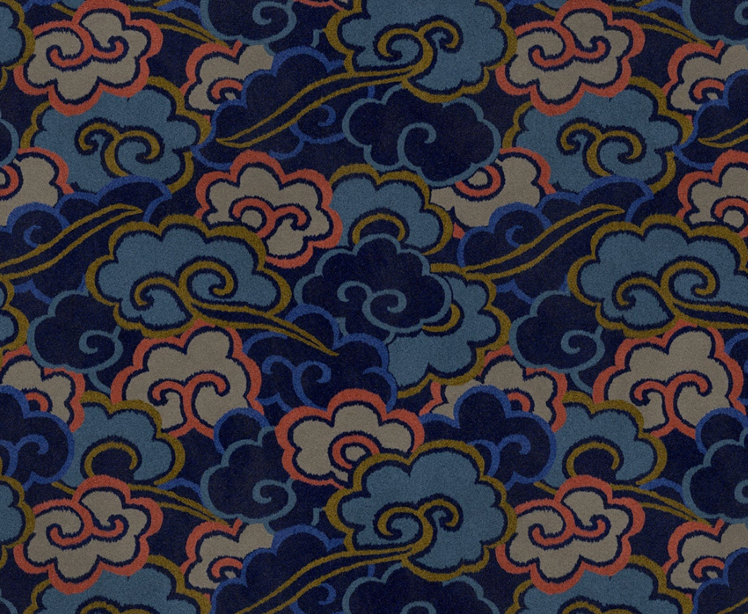 Utterly charming... an enchanting landscape of abstract clouds, inspired by a Japanese kimono. Printed onto velvet, its usable scale offers a versatile choice for upholstery and curtains.