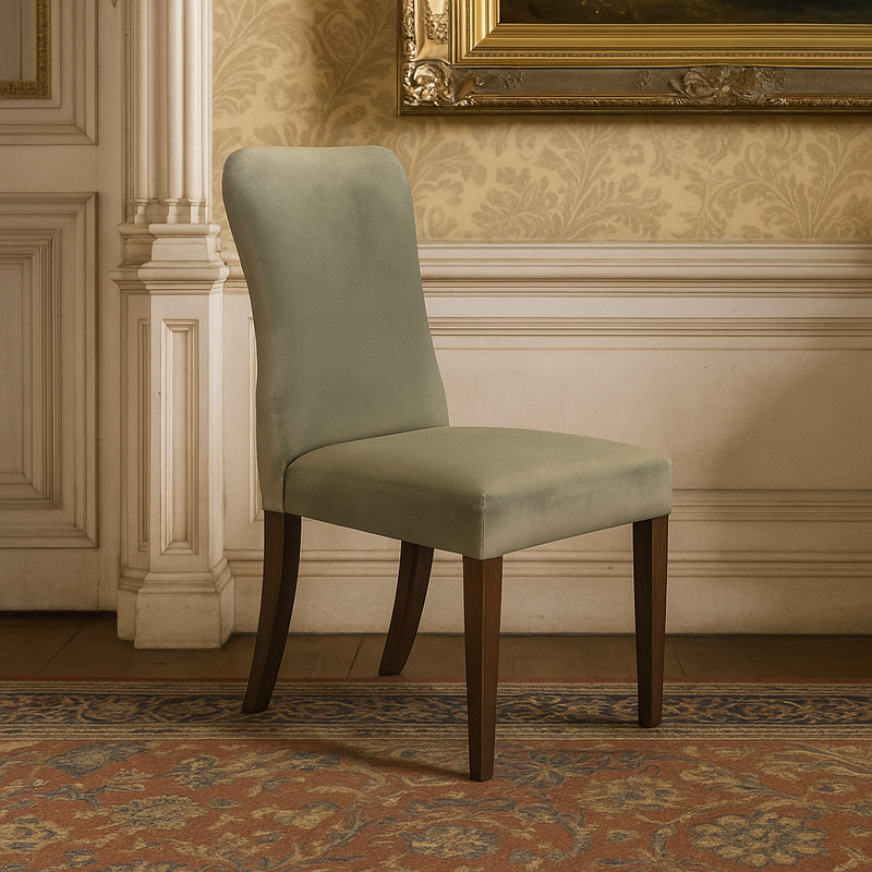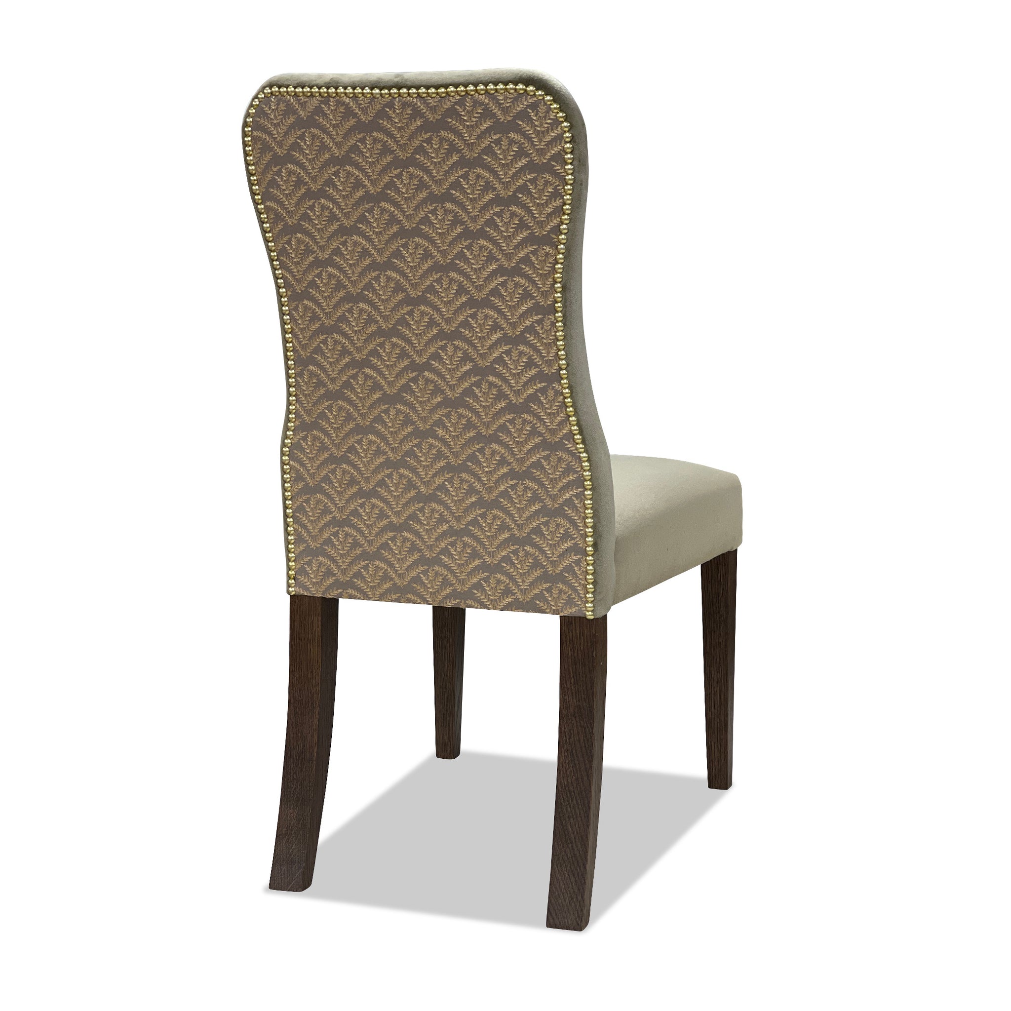 This Marcel dining chair is offered in Jim Thompson Moss Driftwood seat and inside back and OSB in pattern fabric.