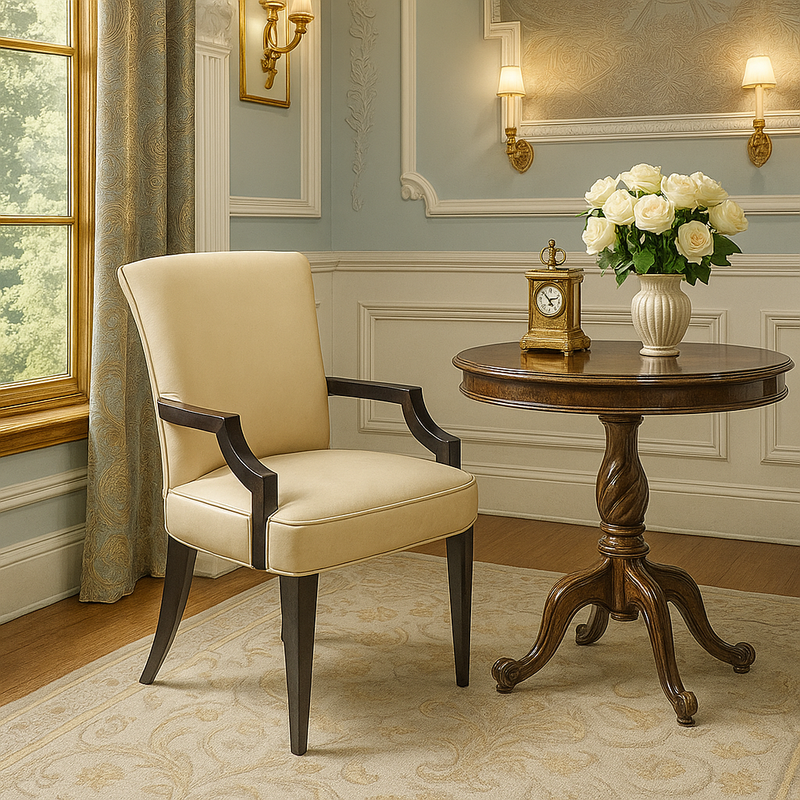 This Standerwick Craver is made up in beige leather and high gloss dark mahogany show wood.